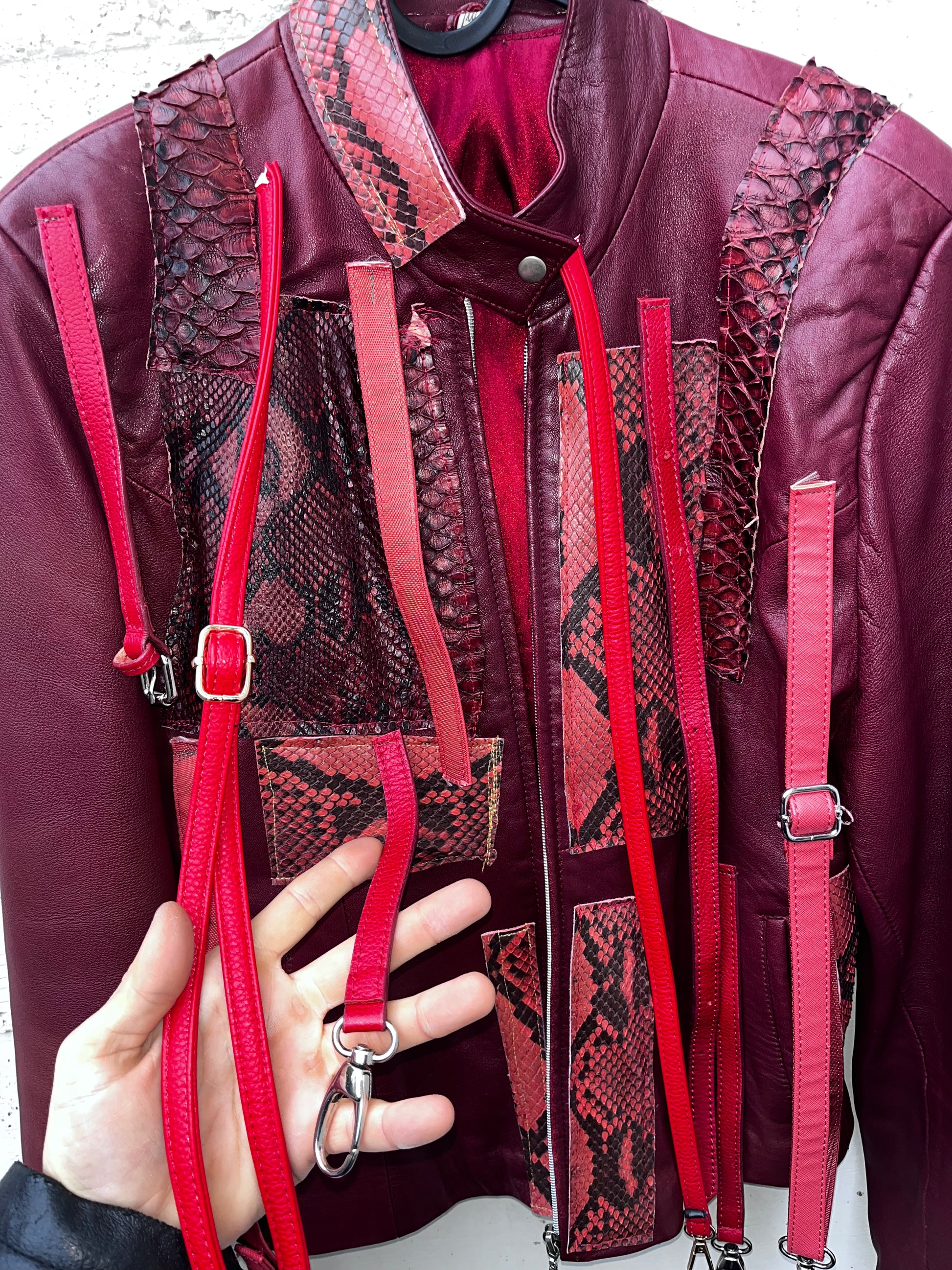 giacca in pelle , coperta di fili di pelle , ganci e vero serpente